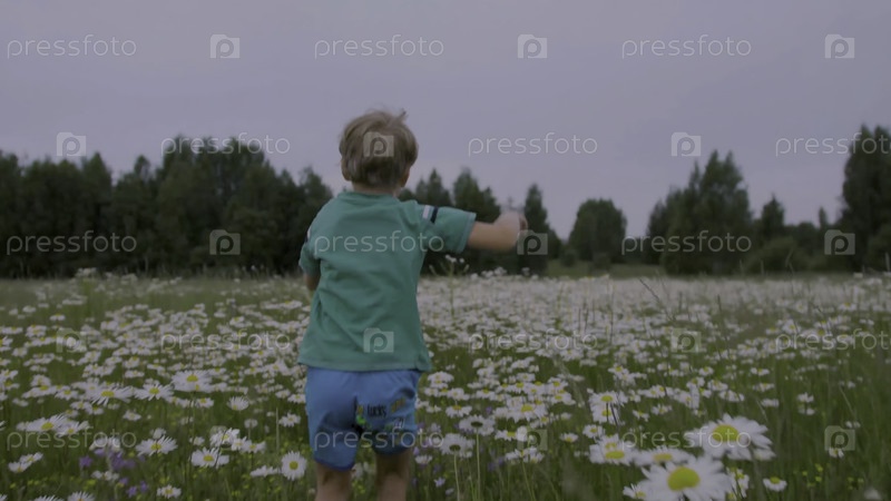 Мальчик бежит по поле ромашки. творческий. счастливый мальчик бегает по цветущему летнему лугу. задний вид мальчика, бегающего через поле ромашки