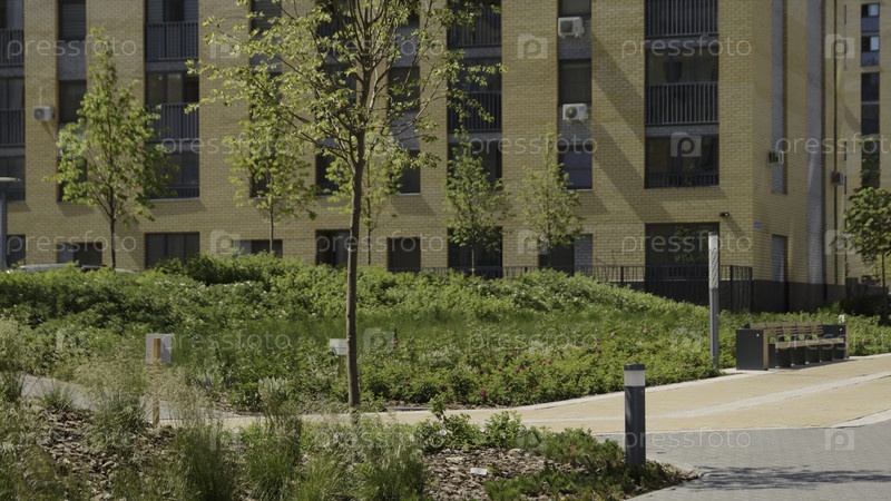Большое высотное здание. резервные кадры. ярко-желтый кирпичный дом, который взят сверху вниз и рядом с ним растет двор и деревья