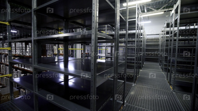 Хранилище, большая логистическая структура торговли.Креативное.Большие металлические полки в современном складе, промышленный склад на фабрике