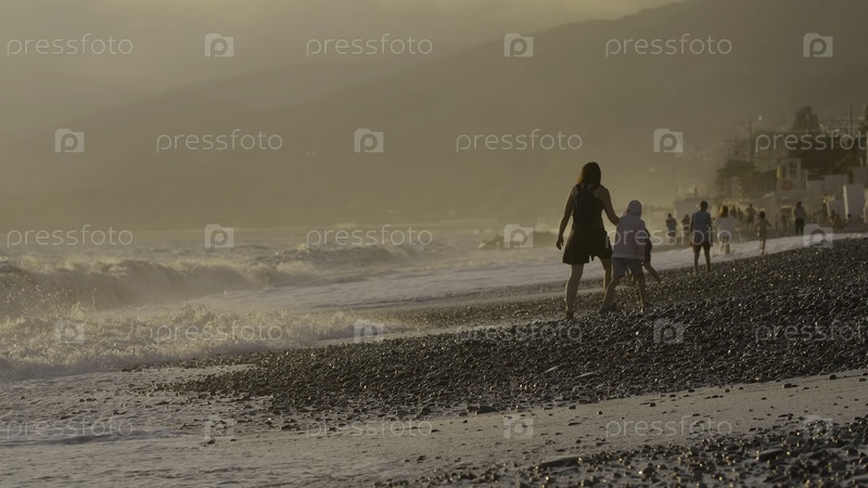 Волны на галечном пляже во время захода солнца. креативность. концепция отпуска, люди гуляют вдоль берега