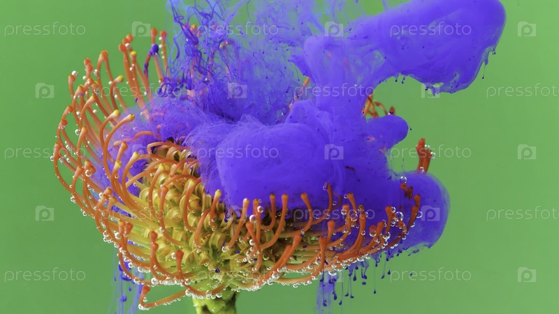 Макрофотография, на которой краска распылена на цветок. резервные кадры. ярко-зеленый фон, на котором цвет в краске во время художественной съемки. высококачественный 4k кадр