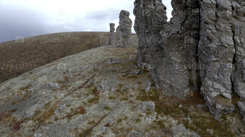 Вид с воздуха на вершину горы со скальными образованиями. Клип. Красивая вершина холма с каменными столбами в осенний сезон