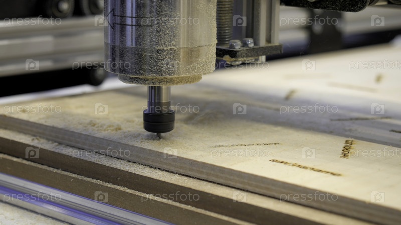 Автоматическая фрезерная машина, закрытие. СМИ. Промышленный фон, резка отверстий внутри деревянного листа