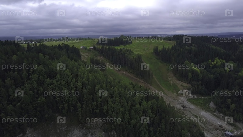 Вид сверху оползня на склоне холма. Клип. Оползень вблизи склона старой деревни летом. Оползень на краю деревни в долине со зелёным лесом и уклоном