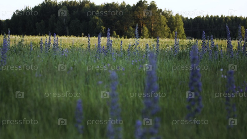 Красивый пейзаж с зеленой травой, где голубые цветы с длинными лепестками растут и развиваются на ветре