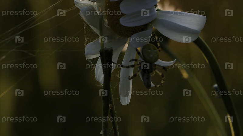 Насекомый паук сидит на цветочной ромашке на размытом фоне летнего луга