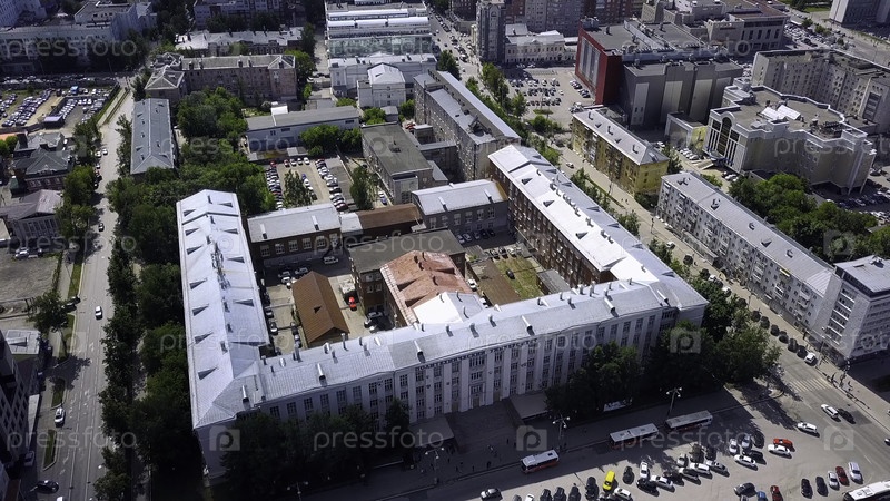 Вид на небольшой летний городок с маленькими 5-этажными домами, большим зданием на площади и различными парками поблизости