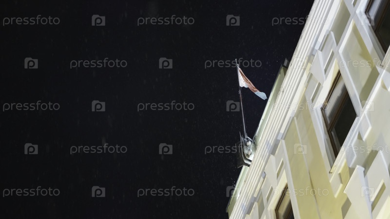 Вид на здание флага ночью. Идите дальше. Здание с флагом против ночного неба. Красивый снег падает на освещенное здание ночью