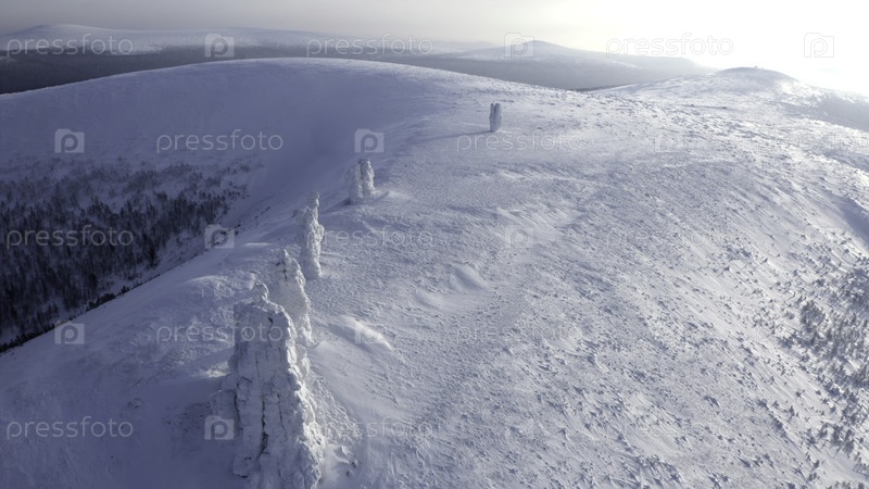 Ландшафт при температуре ниже нуля сверху.Снежные пустые горы со замерзшими холмами и деревьями видны на ярком небе