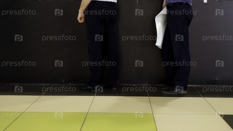 Люди за информационным столом. СМИ. Мужские ноги встают и ходят в приемной