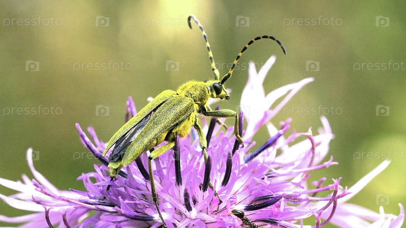 Насекомые сидят на цветочном почках в летней лужайке.Креативно.Жук, сидящий на цвете на размытом зеленом фоне луга