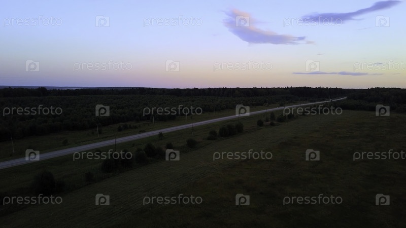 Живописный вид из воздуха на долину с пихтовым лесом, зеленым полем и двухполосной дорогой
