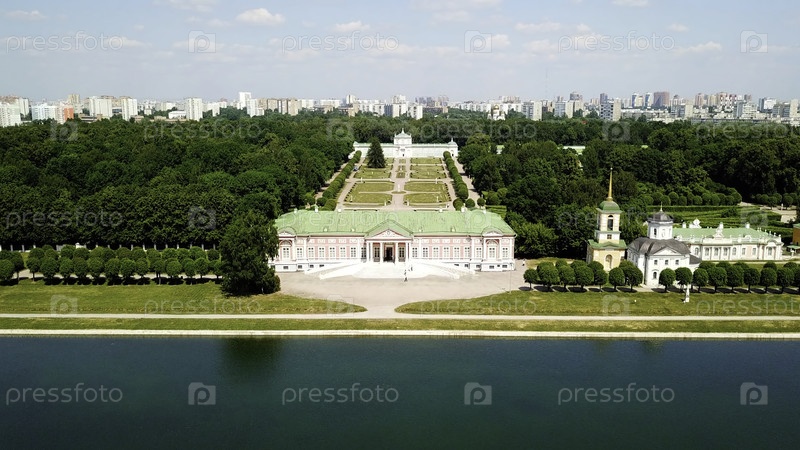 Красивый зеленый город с высокими зданиями, домами, парками, зелёными лесами и голубой рекой