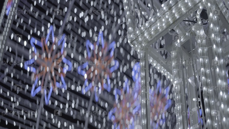 Рождественские уличные фонари. давай. красивый яркий пейзаж для новогоднего города. светящиеся и мерцающие гирлянды в ночном городе