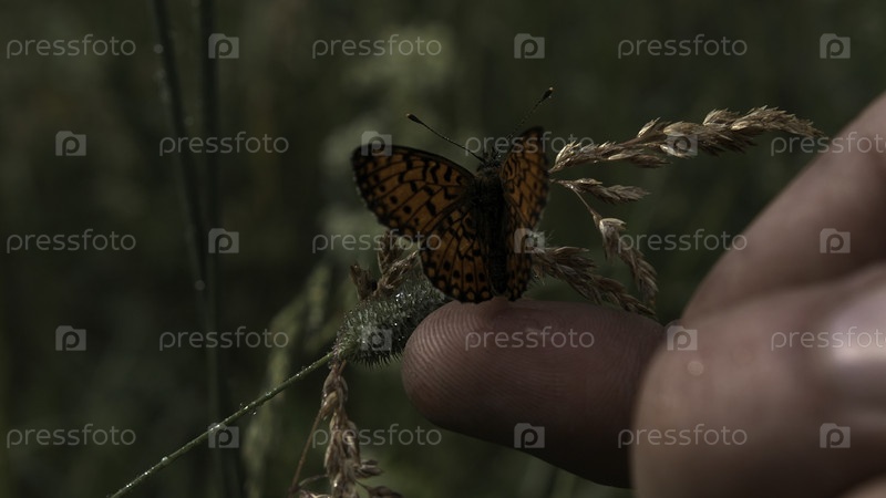 Большая красная бабочка сидит и хлопает крыльями и садится на сухую ветвь травы