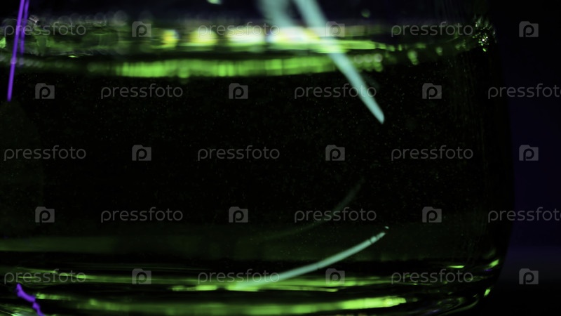 Закройте пустой прозрачный стакан, наполненный зеленой газировкой. Застежка. Стенка с красочным освещением ночного бара