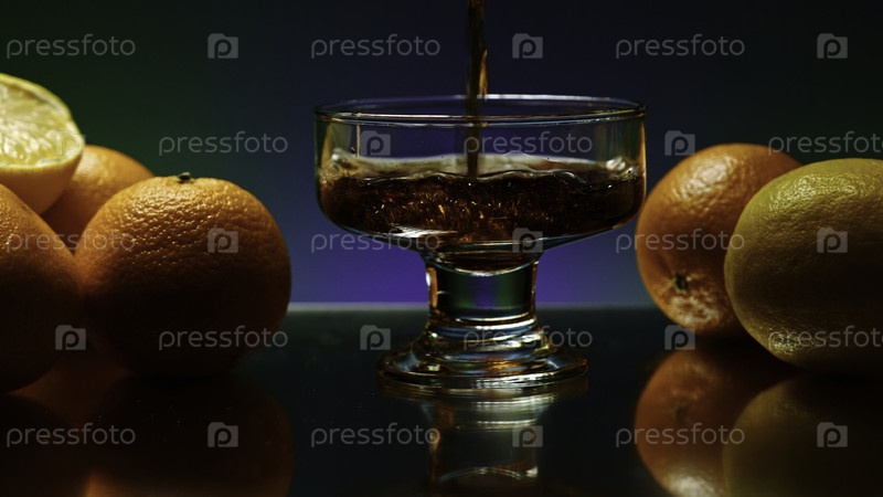 Виски наливают в стакан на красочном стеновом фоне. Клип для акций. апельсины, лежащие на столе в ночном клубе
