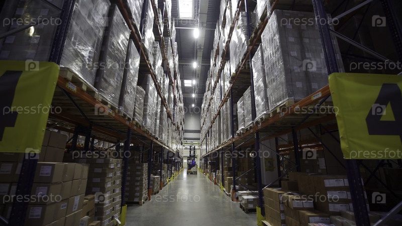 Москва, Россия - 24 февраля 2022: Большая кладовая с полками и ящиками. Креативная. Многие полки и коробки в современном складе предприятия или магазина. Большой оборудованный склад с товарами