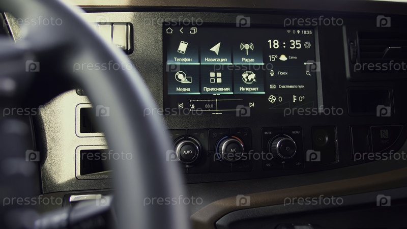 Закройте колесо и приборную панель грузовика.Сцена.Вид внутрь автомобиля