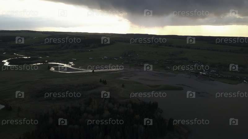 Вид на реку. Клип. Река с изогнутыми узорами возле деревни в пасмурный день. Деревня со изогнутой рекой в пасмурный день летом