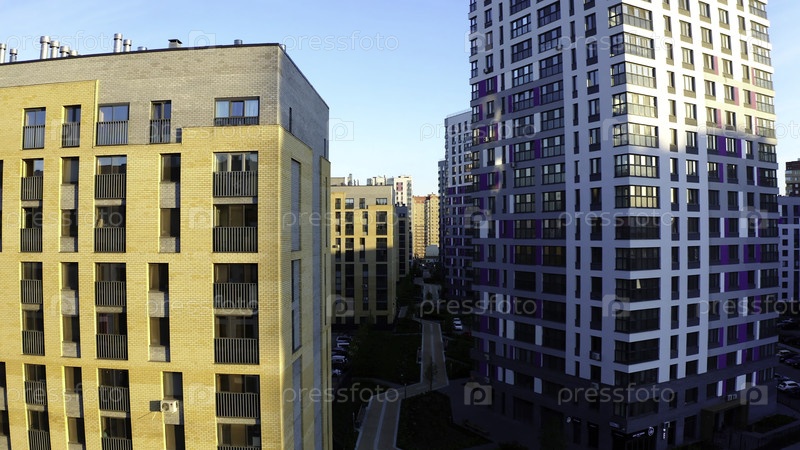 Вид из воздуха городского района с многоэтажными жилыми домами. Резервные кадры. Лететь возле домов в городской спальной зоне с парковкой и зеленой лужайкой