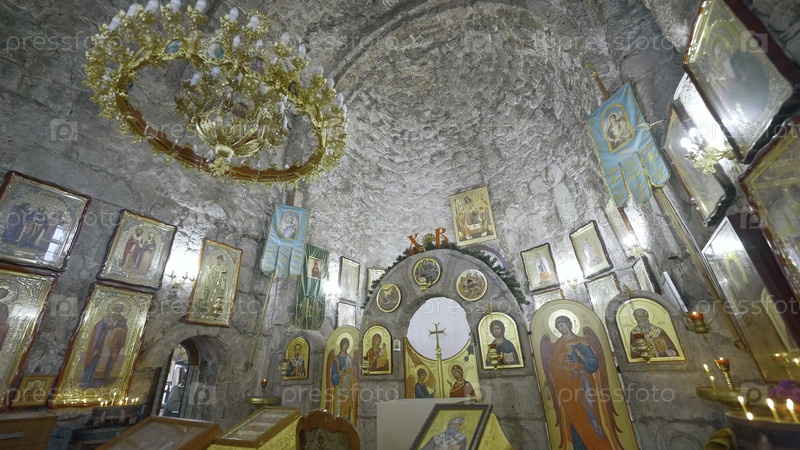 Церковь в каменной пещере. Продолжайте. Интерьер пещерной церкви с иконами. церковный алтарь внутри каменной пещеры. религиозно-христианский алтарь со золотыми иконами с каменными стенами