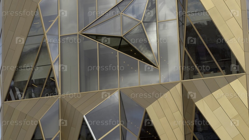 Полет вокруг сложного современного здания с геометрической формой и зеркальными окнами. Резервные кадры. Строительство с необычной архитектурой, небоскреб, офисный блок в деловом районе большого города