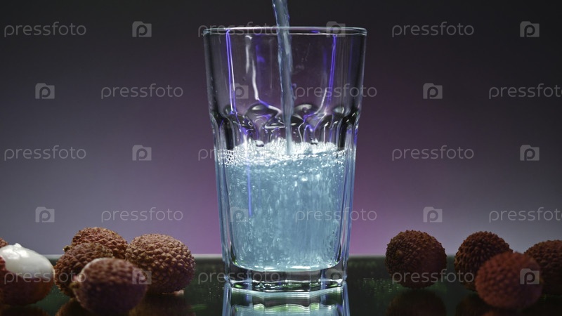 Синий напиток наливается в стакан на изолированном фоне. Стеклянный клип. Углеродный синий напиток заливают в прозрачное стекло в баре. Яркий напиток с ингредиентами и фруктами вокруг