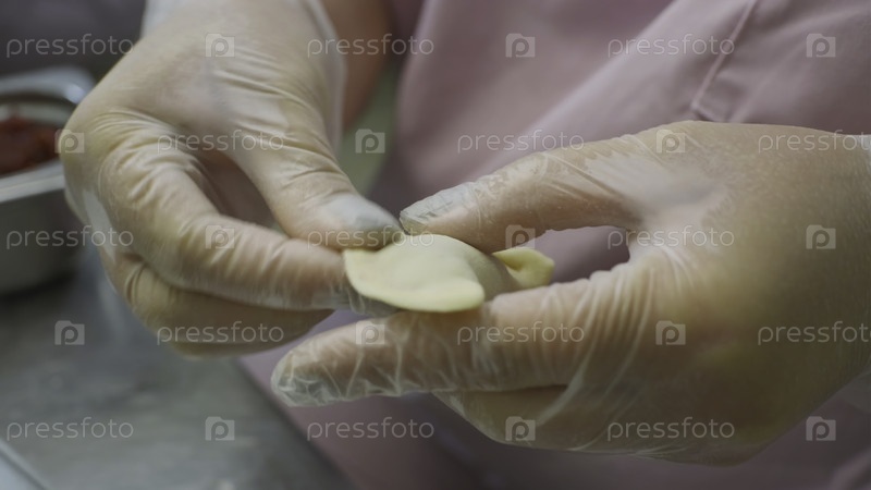 Масштабное моделирование пельменей.Женщина в перчатках делает пельмени на кухне.Кухарь красиво скульптурирует