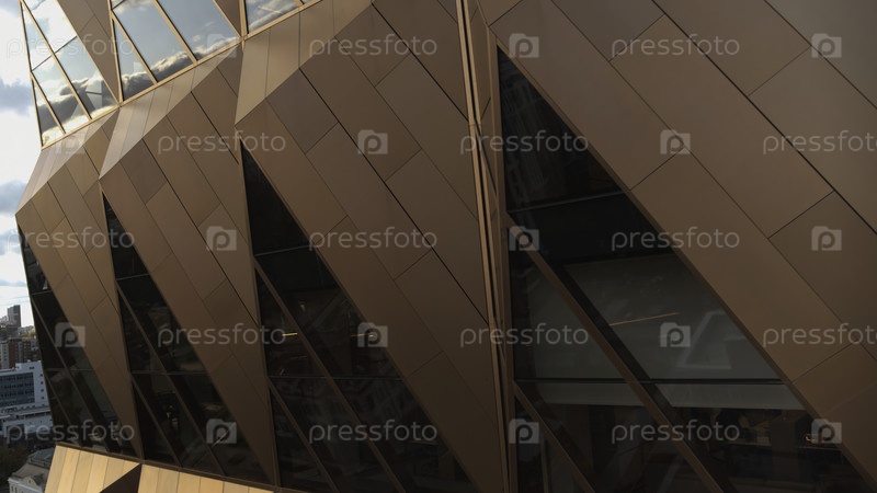 Вид на архитектуру современных окон здания с отражением. Резервные кадры. Отражение неба в окнах современного офисного здания. Стильная архитектура современного здания с отражением и голубым небом