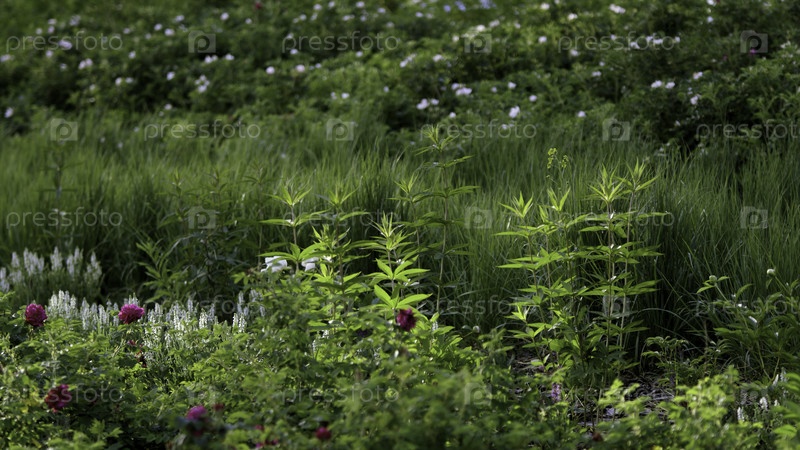 зеленая трава и цветы в летнем саду. резервные кадры. красивая лужайка с зелёными кустами под солнцем