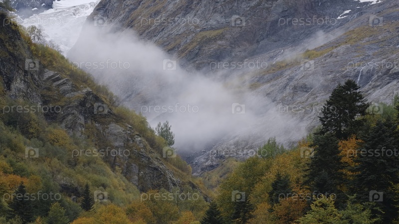 горный пейзаж с небольшими облаками, движущимися в долине. творческий. осенняя долина со скалистыми склонами и двигающимися облаками. туманные низкие облака таинственно перемещаются в горно-осенней долине