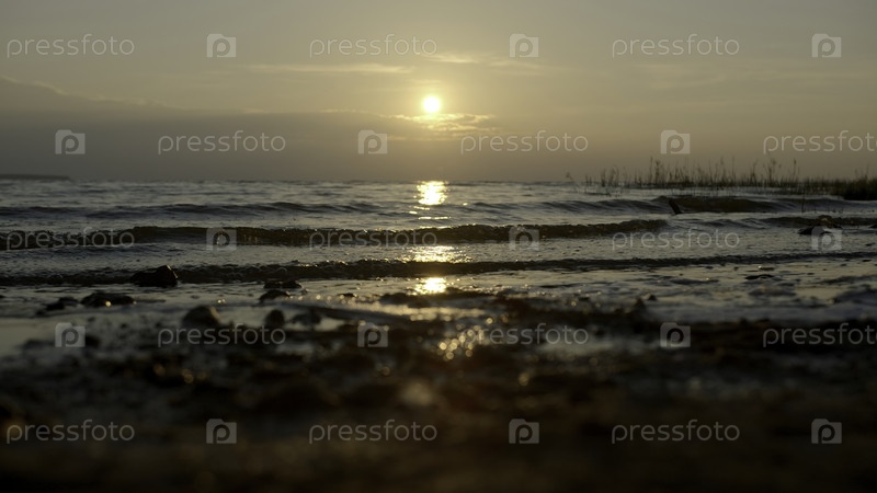 Ближайшее изображение маленьких волн на фоне заката. творческий. качающиеся малые волны на берегу моря с горизонтом захода солнца. волны посреди морского заката