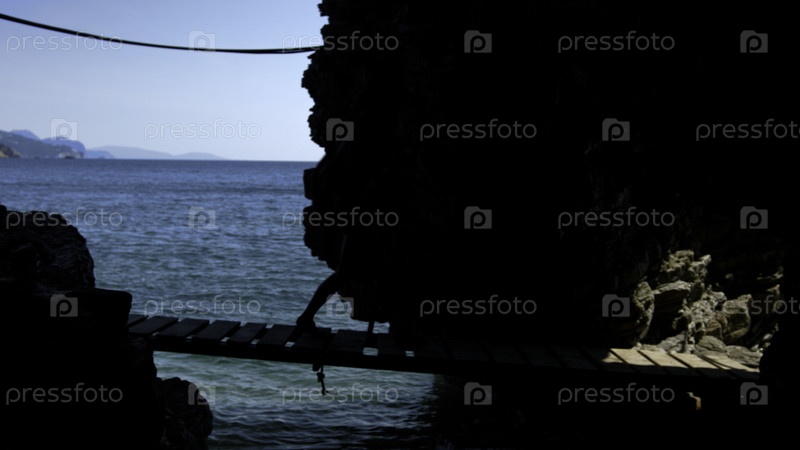 Пахнет морем. Креативно. Волны голубого прозрачного моря бьют о камни, где виден мост с ходящими туристами. Высококачественный персонал FullHD