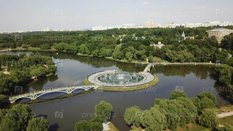 Вид на красивый мост с озером в дворцовом парке. творческий. пейзаж парка и озера с мостом и островом во дворе. музей-заповедник в Царицынском дворце
