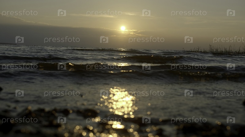 Ближайшее изображение маленьких волн на фоне заката. творческий. качающиеся малые волны на берегу моря с горизонтом захода солнца. волны посреди морского заката