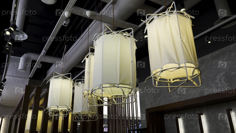 Стильные светильники в интерьере кафе. HDR. Интерьер в современном кафе с лофт-дизайном. Стильные огни и лампы в лофт-кафе