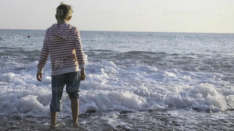 Мальчик в море с большими волнами. творческий. мальчик отдыхает на море с волнами в замедленном движении. красивый и веселый праздник на море