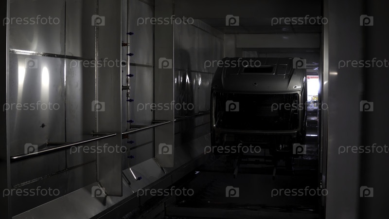 Демонтированный грузовик.Сцена.Большие разобранные части машины, которые промываются перед покраской
