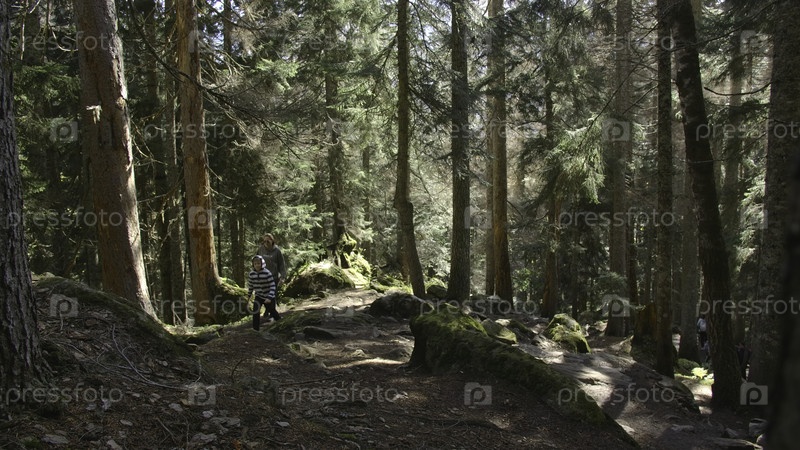 Мать и ребенок поднимаются в лес. творческие. семейные походы по холмистому лесу летом. красивый летний лес с прогулками на восходе