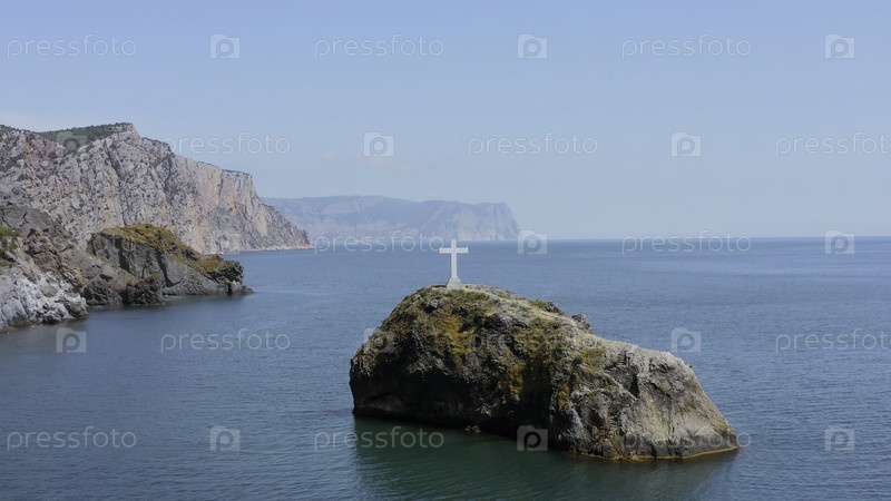 Большой крест на островном камне.Пойдем дальше.Переход на острове в море в солнечный день.Вид большого креста на острове в море у побережья летом
