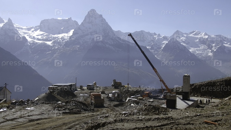 Строительная площадка на фоне горных вершин. креативность. строительство с тяжелым транспортом в горах. стройка высоко в горах на фоне снежных пиков