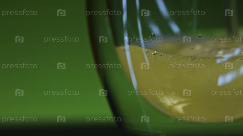 Ближайшее изображение алкогольного напитка с пузырями, заливаемого в стакан. Клип для акций. Цветный напиток наливается в прозрачное стекло. Барные и спиртные напитки