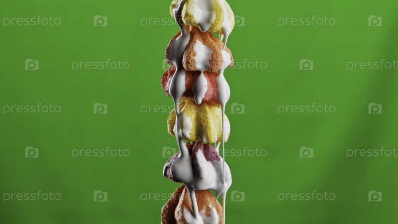 Цветные сладости со сливком на зеленом фоне. Сток-клип. Воздушные печенье в жидкой белой смеси. Видео для рекламы добавления сладких продуктов. Сладости и хромаки