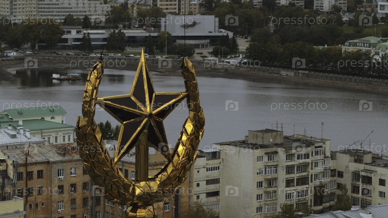Вид сверху со звездой на фоне города. Резервные кадры. Золотая звезда на вершине строительства с панорамой по городу. Золотая звезда на пике против городского фона в пасмурный день