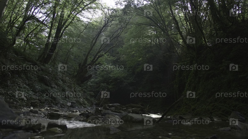 Речная вода и зеленый лес со ступеньками. творческий. плотные дикие джунгли со старой деревянной лестницей. ущелье с рекой в зелёном темном лесу