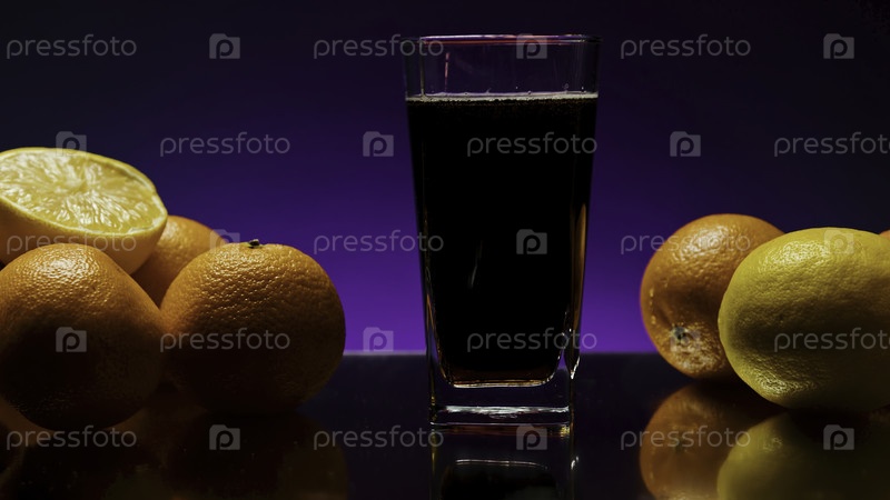 Темный напиток с цитрусовыми фруктами вокруг. Сток-клип. Питье со пеной на фоне цитрусовых и изолированном фоне. Барное питье с цитрусами