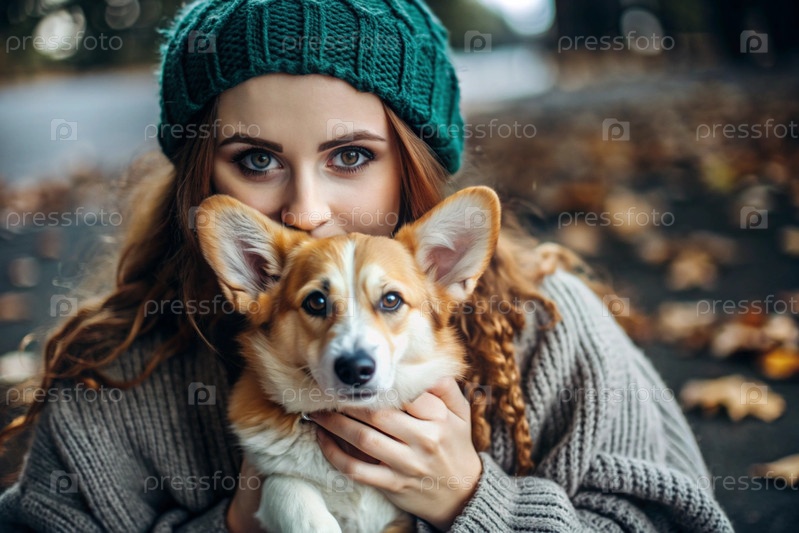 Женщина обнимает валлийскую собаку Корги в осеннем парке.Сознательная жизнь с домашним животным, концепция дружбы и любви к животным