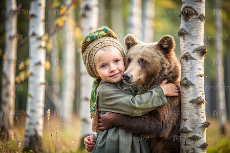 Красивая маленькая девочка в русской народной одежде и с платками на голове в березовой роще с живым медведем Русский фольклор, славянская мифология