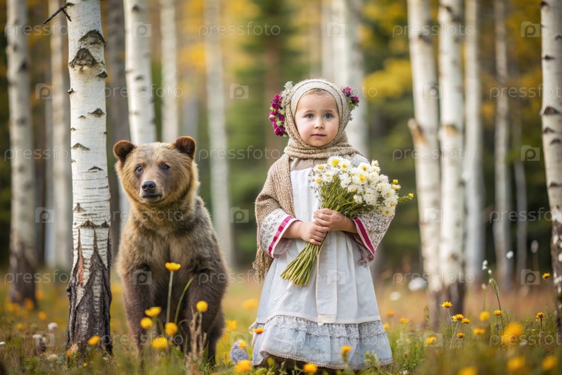 Красивая маленькая девочка в русской народной одежде и с платками на голове в березовой роще с живым медведем Русский фольклор, славянская мифология